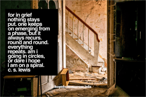 - For in grief nothing ‘stays put.’ One keeps on emerging from a phase, but it always recurs. Round and round. Everything repeats. Am I going in circles, or dare I hope I am on a spiral.