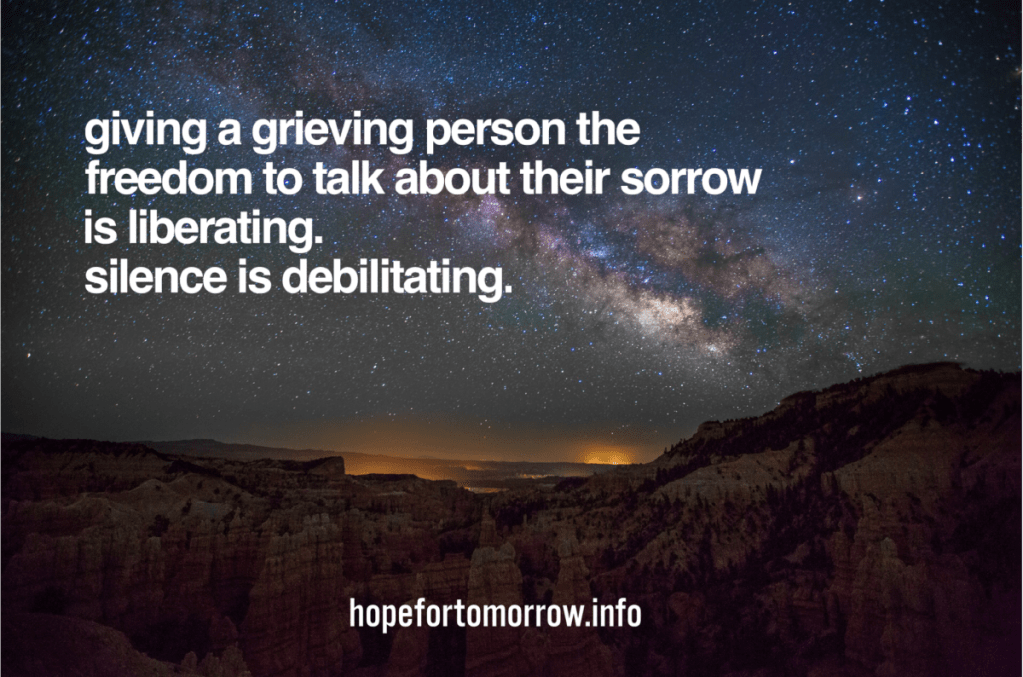 By connecting with their loss, you are giving the grieving person the freedom to talk about their sorrow. This is liberating whereas silence is debilitating. It imprisons.