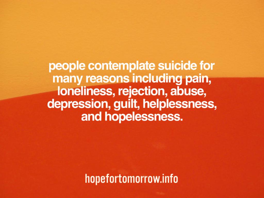 People contemplate suicide for many reasons including pain, loneliness, rejection, abuse, depression, guilt, helplessness, and hopelessness.