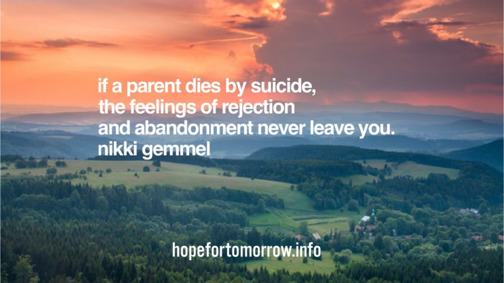 “It’s a universal desire to be needed, and the loneliness of the suicidal act feels like a vicious rebuke. You’re not needed at the bleakest time of a beloved’s life. You couldn’t help them, couldn’t haul them free. If a parent dies by suicide, the feelings of rejection and abandonment never leave you, despite whatever pain they may have been in. You feel as though you weren’t lovable enough – to hold them in your world, to keep them with you; that they didn’t live you enough to want to stay. You could reach the wild places of their mind.”