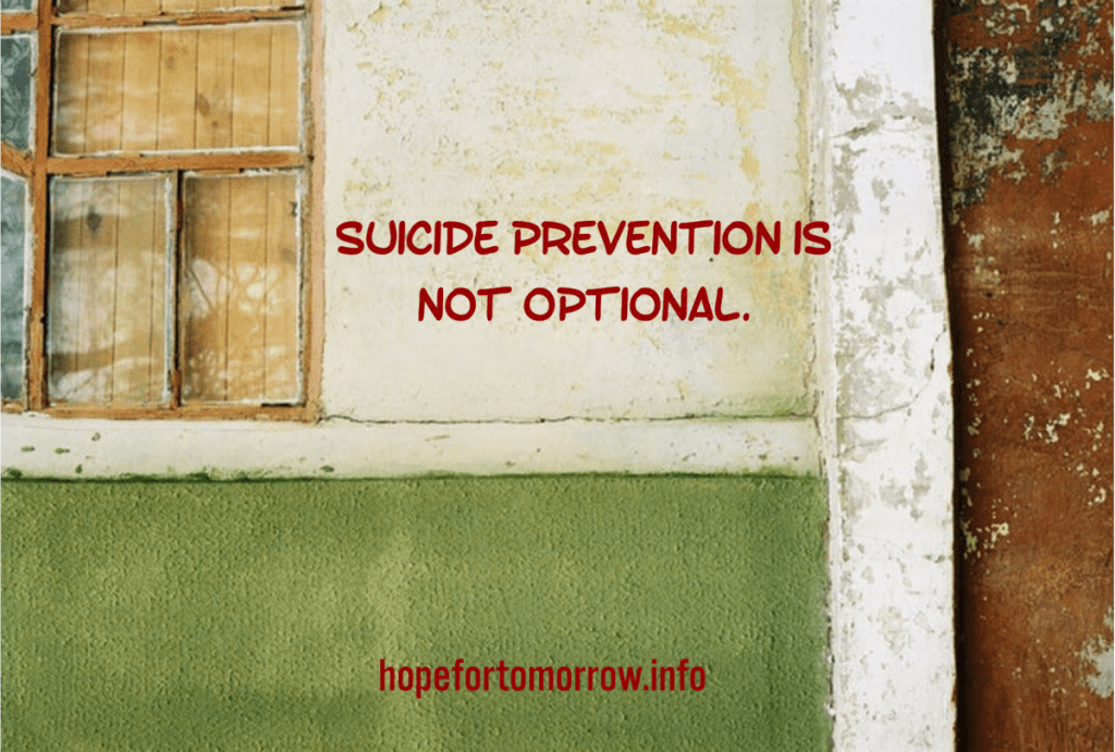 Suicide prevention is not optional. It is a shared responsibility and everyone has something to offer. We can’t just leave it to the professionals. As with most things, our effectiveness will depend on what we know and our willingness to become involved. We need to increase our understanding of suicide, develop our confidence in talking about the issue, and have the courage to provide support when required.