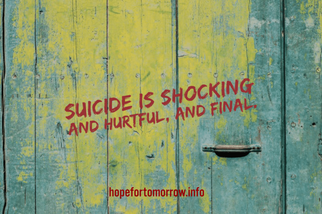 Suicide is confronting. In many instances, suicide is a violent death and is not something you want to dwell on. Talk of death can be depressing and you may not want to go there. You prefer to focus on the positive aspects of life.