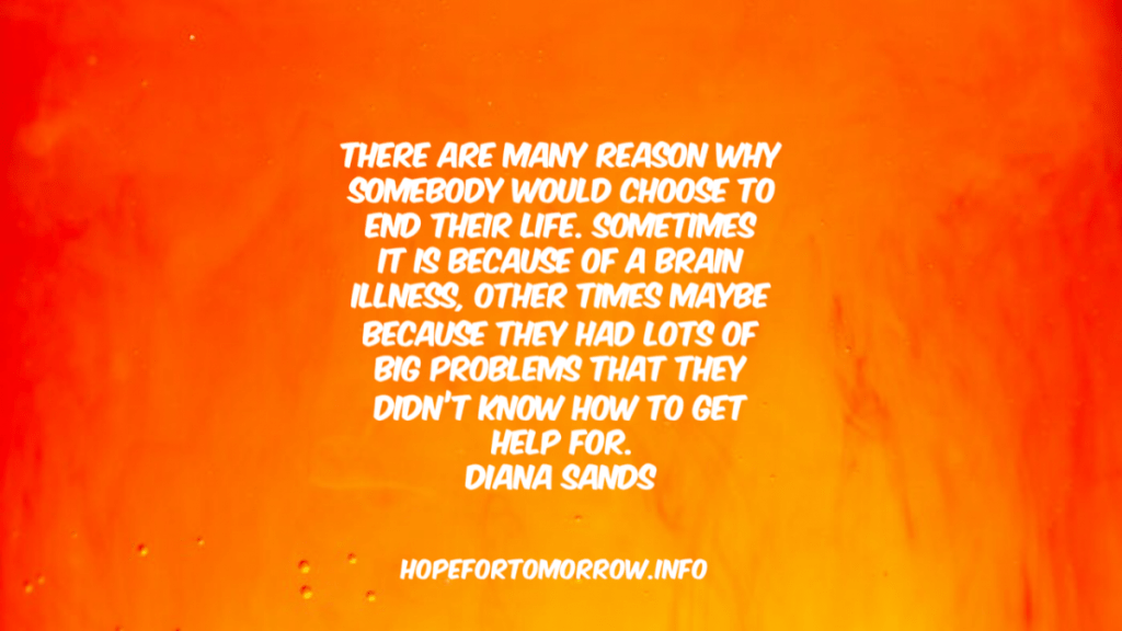 “There are many reasons why somebody would choose to end their life. Sometimes it is because of a brain illness, other times maybe because they had lots of big problems that they didn’t know how to get help for.” Diana Sands, PhD, Director, Centre for Intense Grief