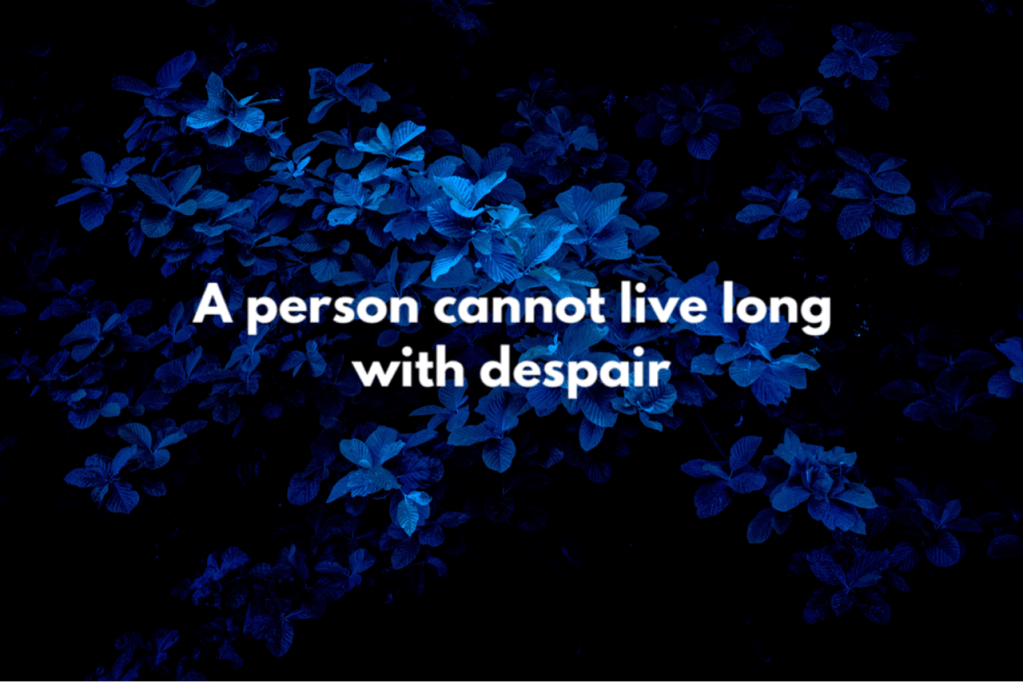 ‘When an individual is in despair, they are feeling a complete loss of hope, usually accompanied by desperation, anguish and sadness. People is despair may get up every day and go about their business, but there is no joy in life.’