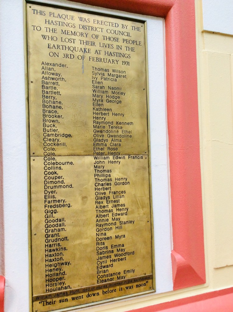 The 1931 earthquake caused widespread devastation, reducing many buildings in Napier and Hastings to rubble. My father’s second cousin, Marie Buck, was one of seventeen people who died when Roach’s department store collapsed. The clock tower in the centre of Hastings features a memorial to those who died.