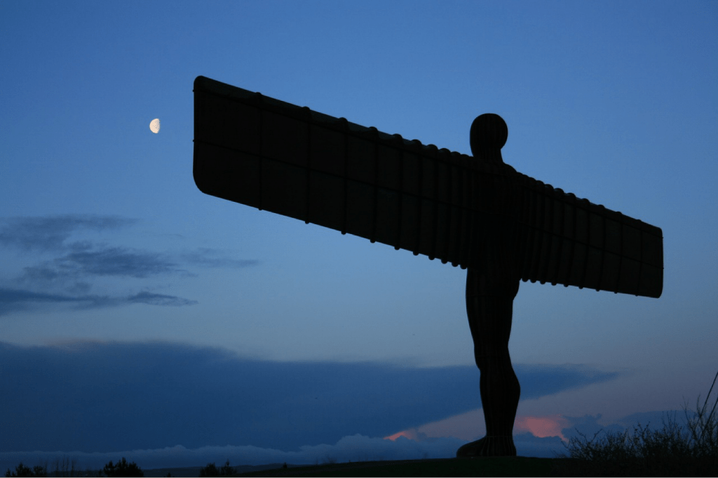 ‘Already the day was over. That low January sky closing down. The spilled red of a winter sun. The land unfolded and cantilevered outwards, like breathing deeply. Ripon. Bedale. Scotch Corner. Durham. By the time she reached the Angel of the North it was dark again, the sky high-starred. The sculpture appeared before she expected it, leaning out of a hilltop ahead. It was hard to see, but the moon caught the span of its wings and she saw how wide out they stretched, how horizontal, not like ethereal wings at all, and she had the fleeting impression that if this angel came from anywhere, it would not be the heavens or the sky, but somewhere more human and earthbound.’