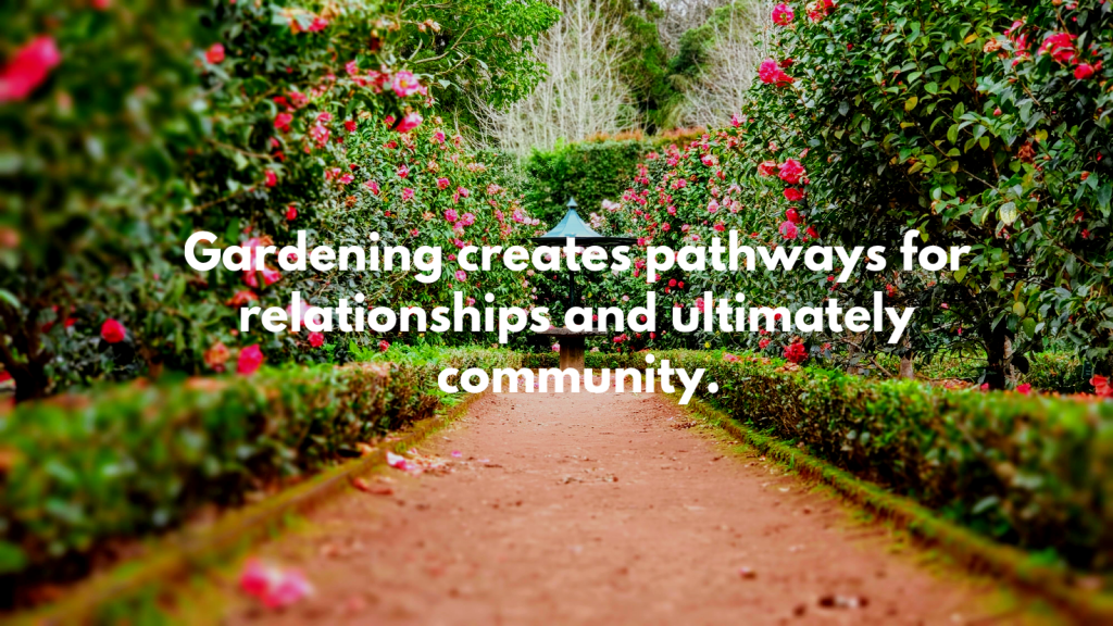 Gardening is about communion, experiencing a connection with people past and present, and with the soil. While gardening can be a solitary pursuit it creates pathways for relationships and ultimately community. The act of caring for plants unites us with other gardeners who share a similar passion.