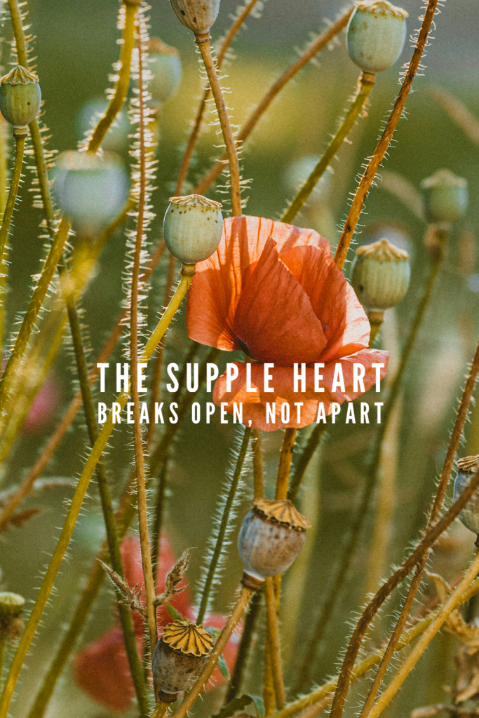 The supple heart is something else. It breaks open, not apart, allowing for growth toward completeness. He says,